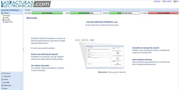 En la parte superior se puede observar la barra de estado de los folios contrados, los emitidos, los disponibles y los cancelados. En el centro de la ventana se muestra información de ayuda para los clientes.
