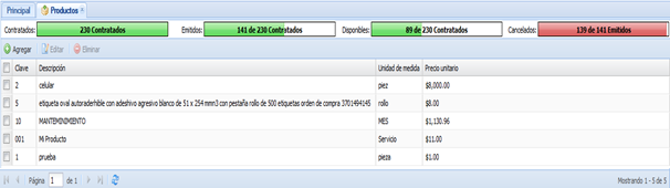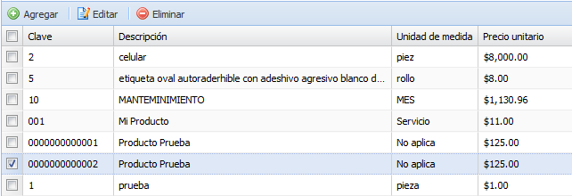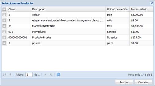 Para agregar un producto desde el catálogo, pulse el botón “Agregar de catálogo”. Aparecerá la siguiente ventana en la cual podemos seleccionar el o los productos que deseamos agregar al CFDI. Para agregar los productos seleccionados al CFDI, hacemos clic en el botón “Aceptar”.