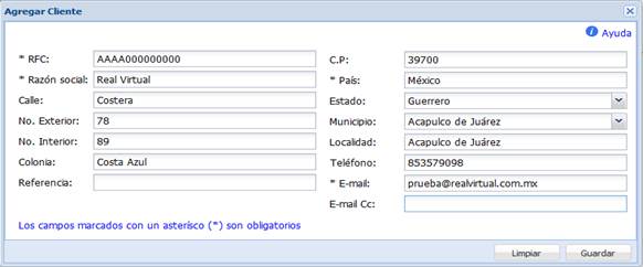 NOTA: Los campos señalados con * son obligatorios. Incluso, el campo correspondiente al RFC, E-mail y C.P. deben contener un valor válido. De lo contrario, el botón “Guardar” estará deshabilitado.