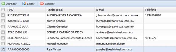 Para eliminar uno o más clientes, seleccionamos el o los clientes deseados y hacemos clic en el botón “Eliminar”.