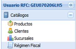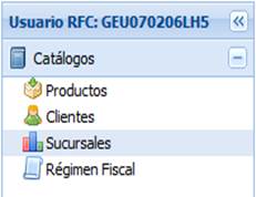 Este módulo contiene cuatro catálogos que pueden ser alimentados por el usuario. Estos catálogos almacenan información de productos, clientes, sucursales y regímenes fiscales de la empresa.