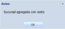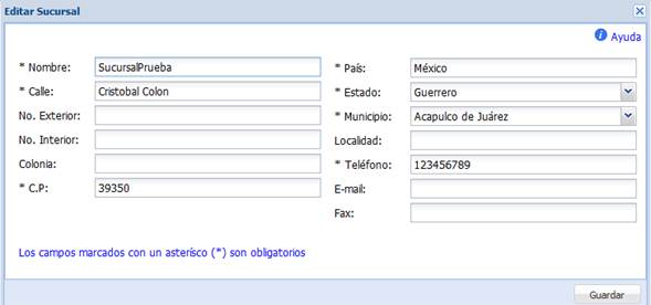 A continuación, aparece una ventana en donde escribiremos los datos de la sucursal. Para agregar la sucursal capturada en esta ventana, pulse “Guardar”.