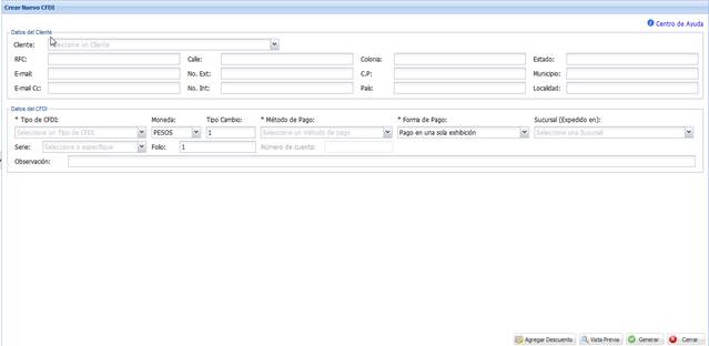 NOTA: Si en el módulo “Nueva Factura” no aparece el tipo de CFDI que desea, configure la información del módulo “Tipos de comprobantes”. Por último, cierre y vuelva a abrir el módulo “Nueva Factura” para visualizar los cambios realizados.