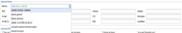 1. Seleccione a su cliente. Utilice la lista desplegable para visualizar a todos sus clientes y seleccione al que desee realizar el CFDI.