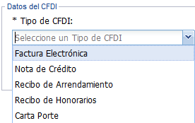 2. Seleccione un tipo de CFDI. En la lista desplegable encontrará los tipos de CFDI habilitados en el sistema.