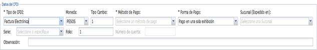 3. Complete otros datos. Especifique, si lo desea, el tipo de moneda, el método de pago, la forma de pago, la sucursal (proveniente del catálogo de sucursales), el folio, la serie, el número de cuenta (si la forma de pago es diferente a efectivo y no identificado) y una observación.