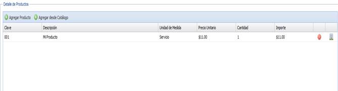 4. Ingrese los productos del CFDI. Puede ingresar en la tabla productos provenientes del catálogo de productos o especificar uno nuevo de manera temporal, es decir, sólo para la creación del CFDI y no para almacenarse en el catálogo de productos. Estas operaciones se pueden realizar haciendo clic en los botones “Agregar producto” y “Agregar de catálogo”. Para agregar un producto de forma temporal, pulse el botón “Agregar producto”. Se añadirá una fila a la tabla para que ingrese los datos del producto.
