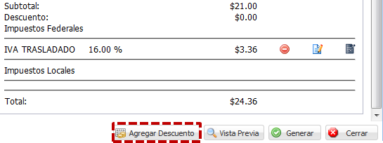 importe a descontar, así como especificar el motivo del descuento. Para aplicar un descuento al subtotal, ingrese un importe o