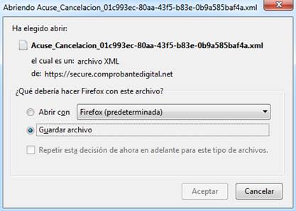 A continuación, aparecerá una ventana similar a la siguiente para confirmar la descarga del archivo XML de acuse de cancelación. Para guardar el archivo en su computadora, seleccione “Guardar archivo” y pulse “Aceptar”.