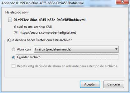 A continuación, aparecerá una ventana similar a la siguiente para confirmar la descarga del archivo XML del CFDI. Para guardar el archivo en su computadora, seleccione “Guardar archivo” y pulse “Aceptar”.