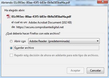 A continuación, aparecerá una ventana similar a la siguiente para confirmar la descarga del archivo PDF del CFDI. Para guardar el archivo en su computadora, seleccione “Guardar archivo” y pulse “Aceptar”.