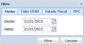 Fecha: Para filtrar CFDIs por intervalo de fechas, hacemos clic en la opción “Fecha”. A continuación, aparecerá una ventana en la que especificaremos el intervalo de tiempo dado por una fecha de inicio y una fecha final. Para realizar el filtrado, hacemos clic en el botón “Filtrar”.
