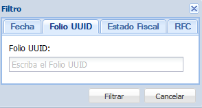 Folio UUID: Para filtrar CFDIs por UUID, hacemos clic en la opción “Folio UUID”. A continuación, aparecerá una ventana en la que especificaremos el UUID del CFDI a consultar. Para realizar el filtrado, hacemos clic en el botón “Filtrar”.