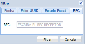 RFC: Para filtrar CFDIs por RFC del cliente, hacemos clic en la opción “RFC”. A continuación, aparecerá una ventana en la que especificaremos el RFC del cliente. Para realizar el filtrado, hacemos clic en el botón “Filtrar”.