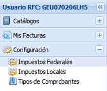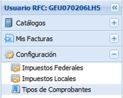 Este menú contiene tres módulos. El primero corresponde al catálogo de impuestos federales que permite definir aquellos que aplicarán por defecto para cada uno de los tipos de CFDIs en el módulo “Nueva Factura”. El segundo corresponde al catálogo de impuestos locales que permite definir aquellos que aplicarán por defecto para cada uno de los tipos de CFDIs en el módulo “Nueva Factura”. El tercero permite habilitar o deshabilitar los tipos de CFDIs que el usuario puede elegir en el módulo “Nueva Factura” para su elaboración y timbrado.
