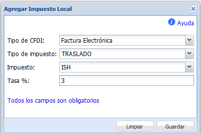 NOTA: Si en el módulo “Nueva Factura” no aparecen los impuestos locales deseados para el tipo de CFDI seleccionado, configure la información del módulo “Impuestos Locales”. Por último, cierre y vuelva a abrir el módulo “Nueva Factura” para visualizar los cambios realizados.