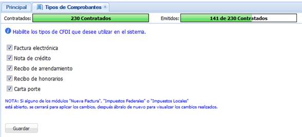A continuación, se muestra el módulo correspondiente en el que podemos marcar los tipos de CFDIs a ser habilitados o desenmarcarlos para deshabilitarlos.