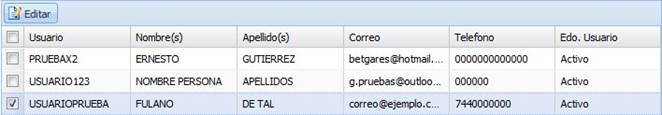 Para editar un usuario, lo seleccionamos y hacemos clic en el botón “Editar”.