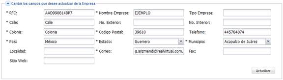 Esta sección permite actualizar los datos correspondientes a la empresa.