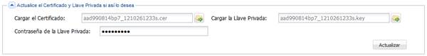 Esta sección permite actualizar en el sistema el archivo del certificado y llave privada, así como su respectiva contraseña.