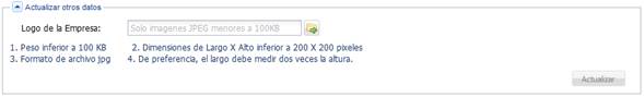 Esta sección únicamente está disponible para usuarios de paga y permite actualizar otros datos de la empresa. Por el momento, únicamente es posible actualizar el archivo de imagen correspondiente al logotipo de la empresa.